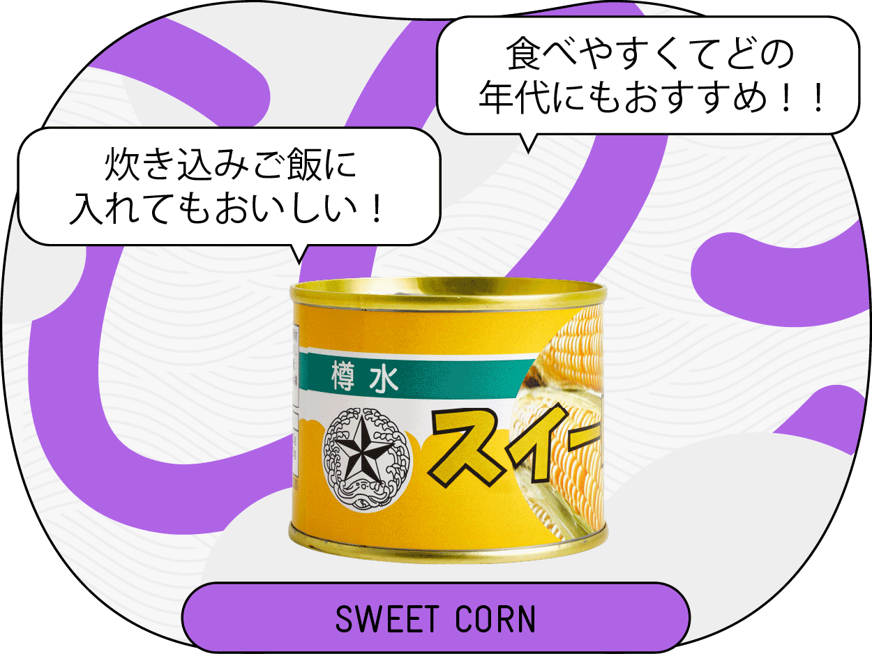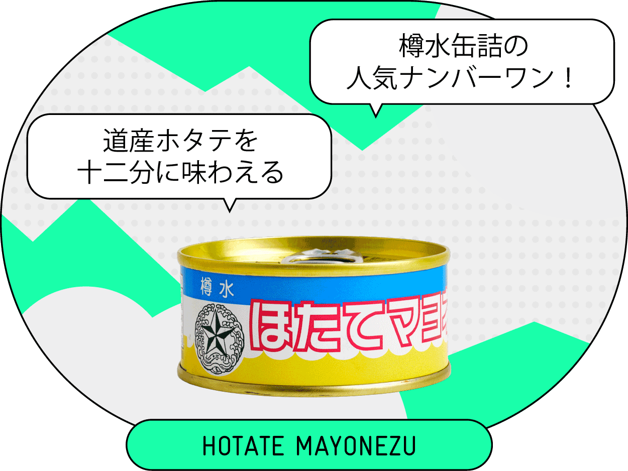 水産のみならず、農産物の栽培や、それを生かした商品開発も行う小樽水産高等学校。こちらは北海道産のスイートコーンを使用した缶詰。「粒の張りと皮の柔らかさが魅力のスイートコーンです。噛んだときのプチッと感が楽しめながら、皮が口に残りません。サラダに乗せたり、炊き込みご飯にしたり、小さな子どもから、お年寄りまでおすすめできる一品です。甘みのあるスイートコーンで味のバランスがとりやすいのも魅力です」(水産食品科/3学年/三田依奈)