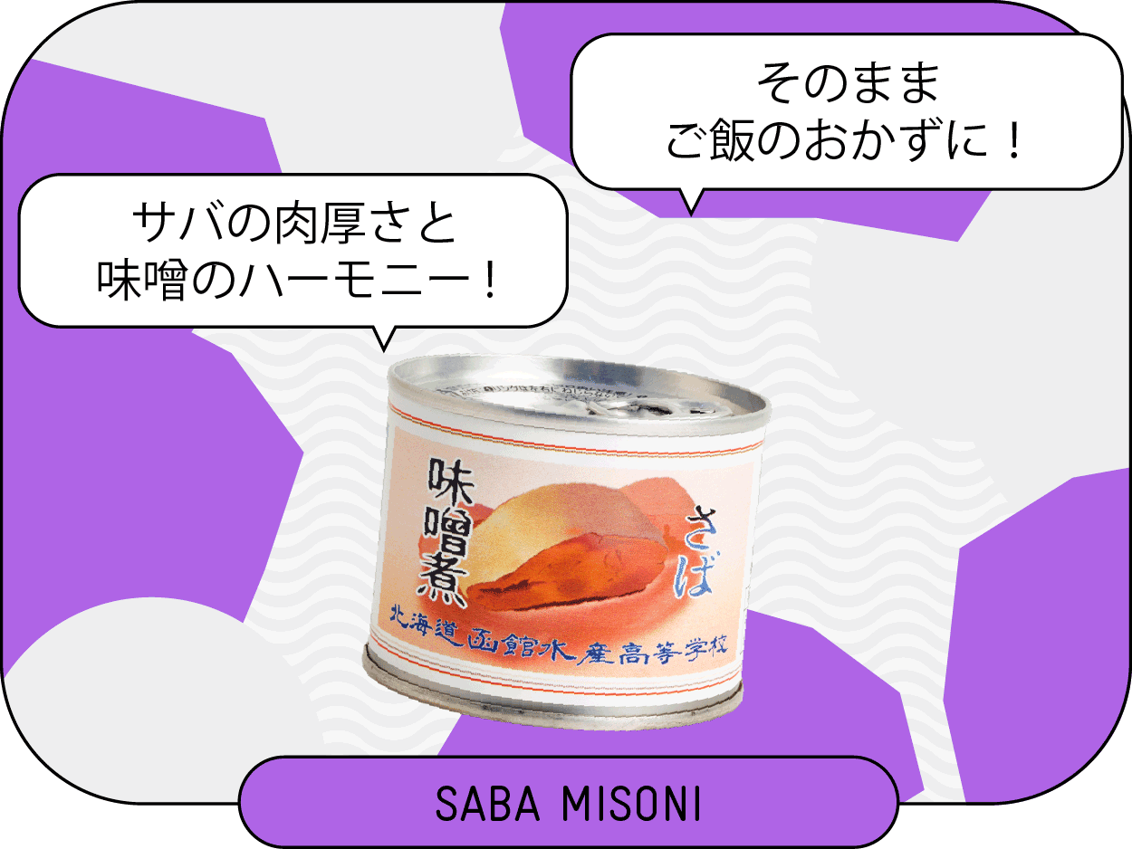 「函館で漁獲されたサバを使用した水煮の缶詰は、とても肉厚で食べ応えがあります。塩味がついているので、さまざまな料理に合うと思います。先生方にひとつひとつ教えてもらいながら、手作業で製造をしているので、市販品に負けない見栄えの良さが自慢です。また異物混入を完璧に防ぐ衛生管理にもこだわっています。また、地産地消をイメージしてパッケージデザインも自分たちで考えました」(水産食品科/2年/森 斗真)