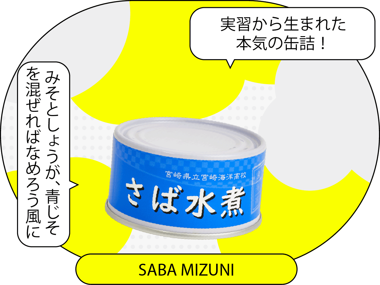 「近年話題の『津本式究極の血抜き』を、考案者の津本光弘氏から直接指導していただき、新鮮なゴマサバを一尾ずつ丁寧に処理して作った『サバ水煮缶詰』です。この処理を行うことによって、魚の新鮮さを長く保ち、身の硬直や魚の臭みを大きく減らしてくれます。処理を行った後、頭、尾、腹を切り内臓を除去し、きれいに洗浄していきます。缶の高さに身をカットし、秤量後、缶を開けたときの断面が美しく見えるように一つ一つ丁寧に詰めていきます。食塩・水を入れ、巻締め、殺菌、冷却、賞味期限の印字、ラベル貼りをしてこの商品の完成です。最新技術と生徒たちのこだわりの詰まった一品です」(海洋科学科/2年/蜷川琉海・水本昊志・杉本達正)