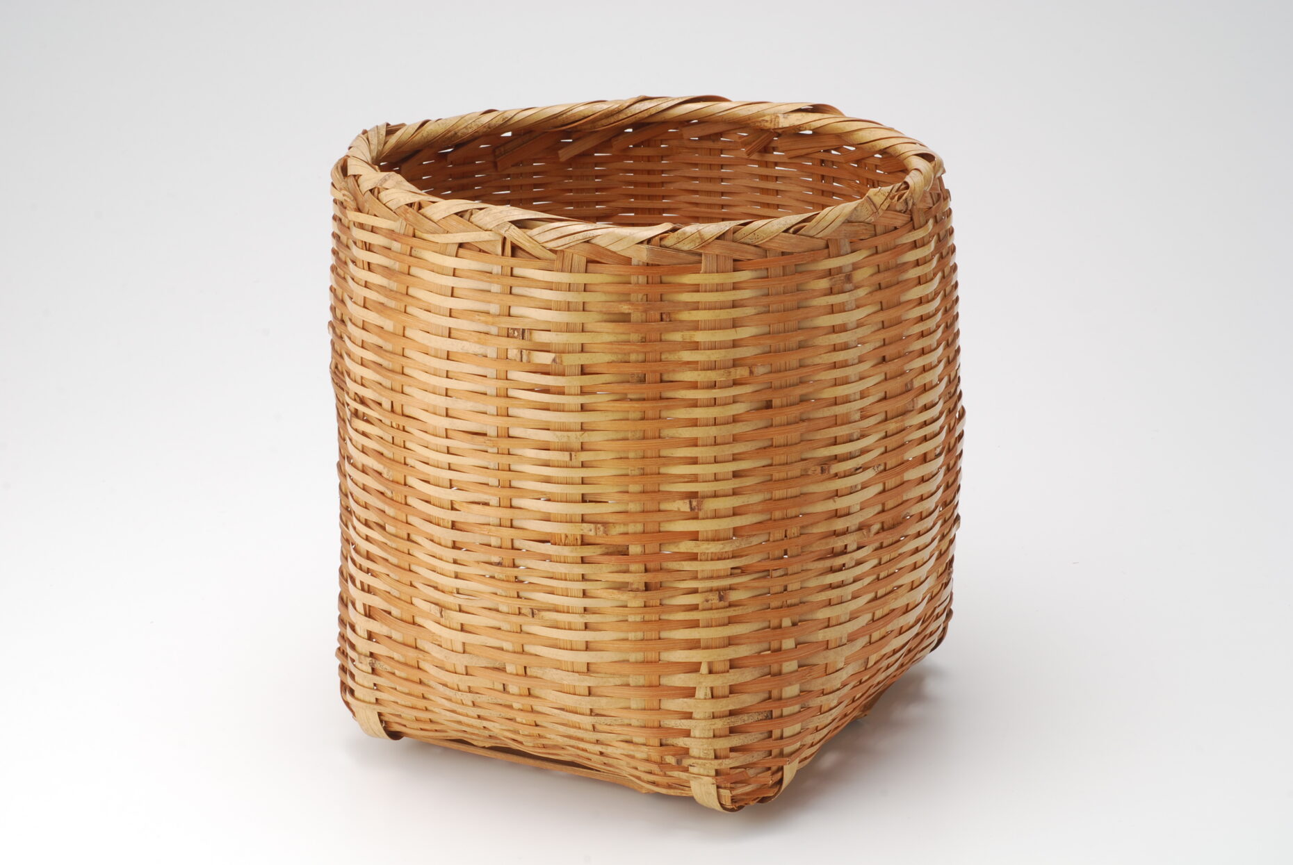 日本一長い砂浜として知られる鹿児島県の吹上海岸のある加世田(鹿児島県南さつま市)で収集された竹籠がふたつあります。ひとつはチャツミテゴ、すなわち茶摘みの手籠という名称ですが、収集時のデータでは、茶摘みや草取り、磯の採取物の入れ物、秋には栗や柿の収穫にも使われた竹籠です。身一つで磯にも畑にも山にも向かう、半農半漁の生活を思い描くことができる民具です。