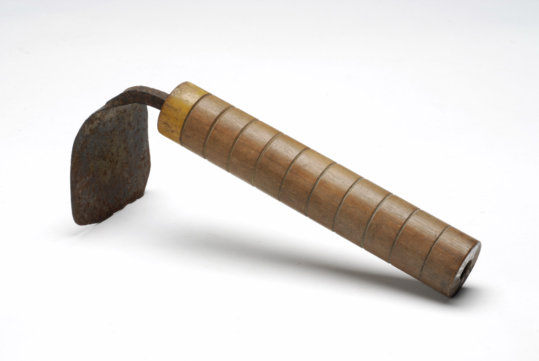 カイカキという貝を掻き取る手鍬は、広島県三原市で収集されました。現在はほとんどが干拓されてしまいましたが、かつては瀬戸内の穏やかな砂浜で潮干狩りをする情景が風物詩となっていました。手の延長にある素朴な民具と言えます。