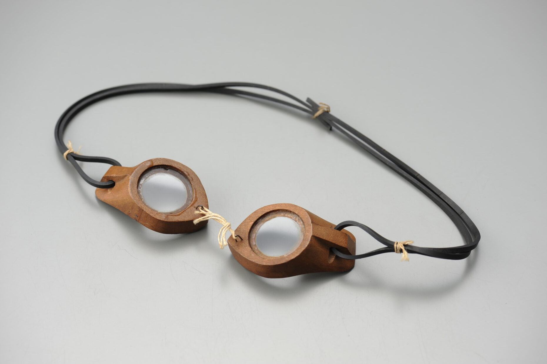 沖縄県の伊是名島で収集された水中眼鏡は、クサトベラという日本では種子島以南に群生する常緑の低木を素材としています。ガラスをはめた水中眼鏡は大昔からあるものではありませんが、風土に根差した南国ならではの素材が生かされた民具と言えます。